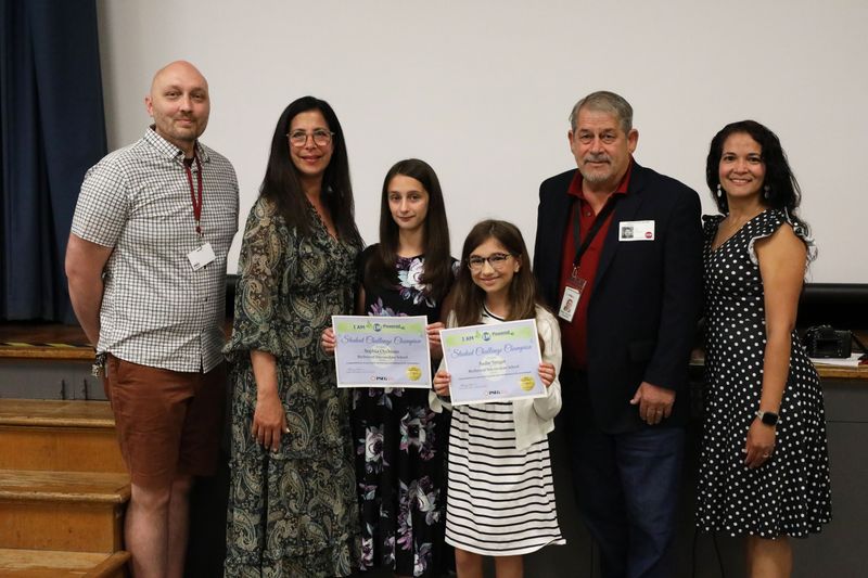 BOE member, Fred Scragg, and Birchwood teachers, Mrs. Guittard and Mrs. Rufrano, were joined by PSEG LI representative Peter Hornick in congratulating Sophia and Sadie.