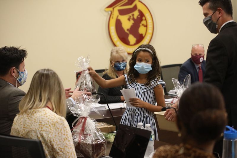 Birchwood students Alice Arevalo and Sam Novick gave celebratory gifts to grateful Board members.