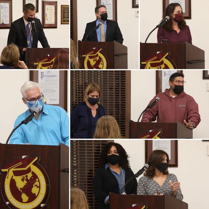 Expressions of appreciation from (top left to bottom right): South Huntington Administrative Association - Ed Smith, South Huntington Chairpersons Association - Jay Corcoran, SHUFSD PTA Council President - Michelle Murphy, South Huntington Teachers' Association - Dennis Callahan, Wildcat Booster Club - Damien Caldwell, and South Huntington Office Staff Association - Karen Cruz-Carrillo and Susan Kiesel.