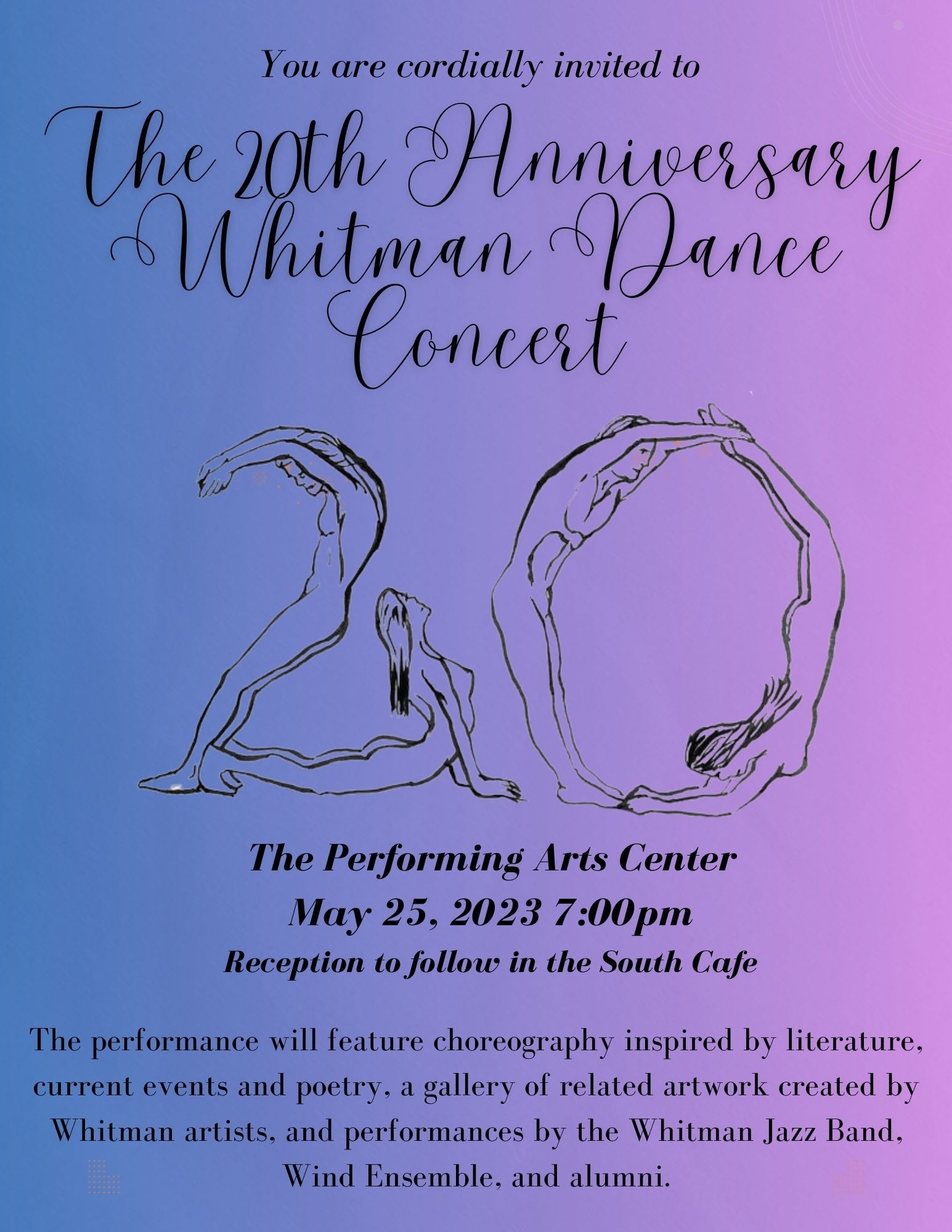 Please join us on Thursday, May 25th at 7PM for performances featuring choreography inspired by literature, current events and poetry, a gallery of related artwork created by Whitman artists, and performances by the Whitman Jazz Band, Wind Ensemble and alumni.